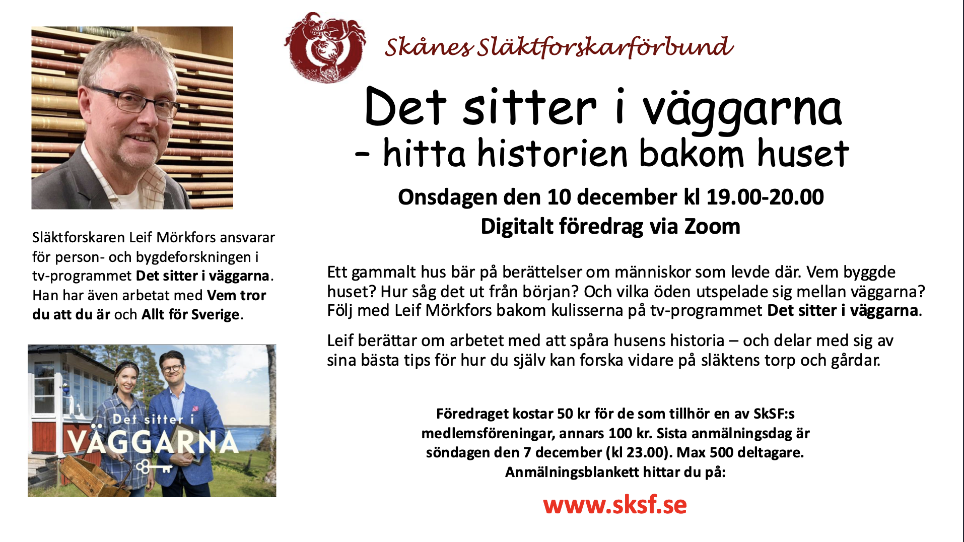 Föredraget kostar 50 kronor för dig som är medlem i någon av Skånes Släktforskarförbunds medlemsföreningar, annars 100 kronor. Sista anmälningsdag är söndagen den 7 december (kl. 23.00). Max 500 deltagare.