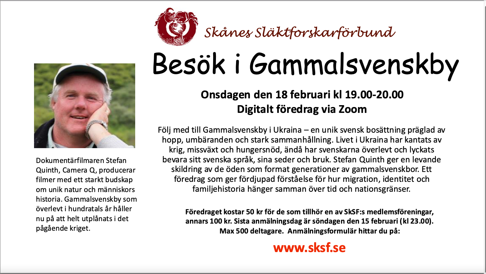 Föredraget kostar 50 kronor för dig som är medlem i någon av Skånes Släktforskarförbunds medlemsföreningar, annars 100 kronor. Sista anmälningsdag är söndagen den 11 januari (kl. 23.00). Max 500 deltagare.